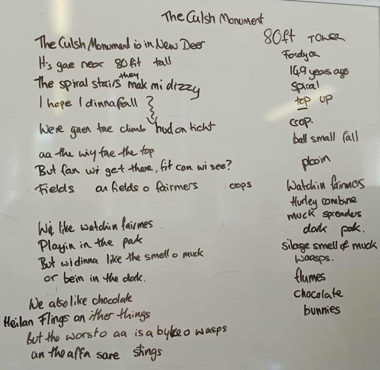 She wanted to write a couple of rhymes with the P3 pupils and asked them what was special about New Deer. There were so many ideas! But they chose to create a rhyme about The Culsh Monument.