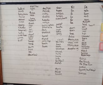 Then it's time for creating a vocabulary of Doric words on the board - fit, fan, foo, far, fae! Words for clothing, words for animals, words for body parts - our favourite Doric words!